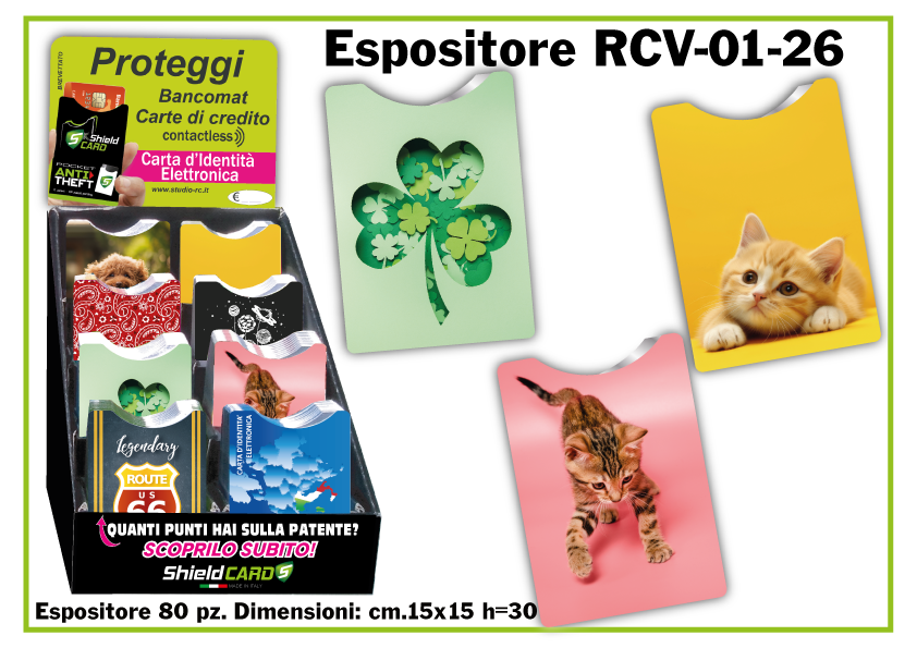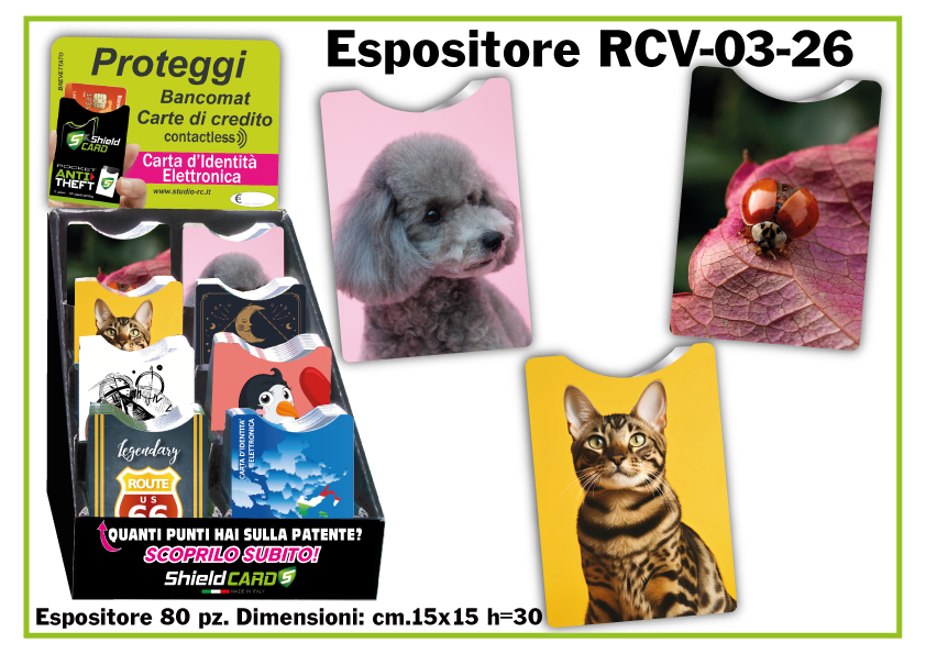 Oltre a produrre shieldcard personalizzati, abbiamo creato una linea nostra proposta all'interno di un espositore da banco, di dimensioni cm. 15x15 h=30 con capienza di 80 Shield card suddivisi in 8 figure per la vendita al pubblico in qualsiasi tipo di attività commerciale.