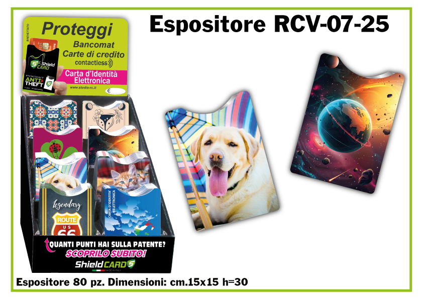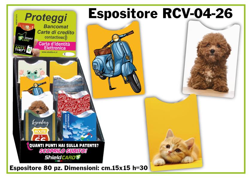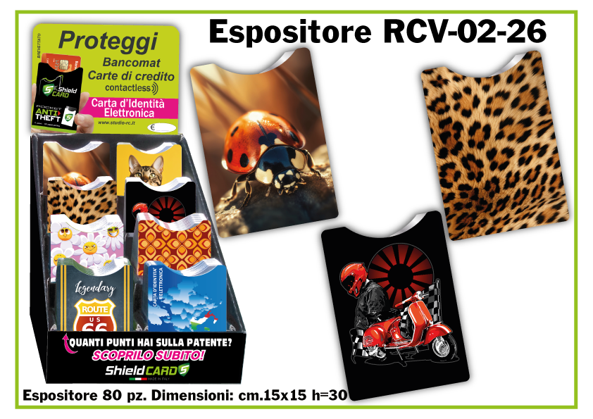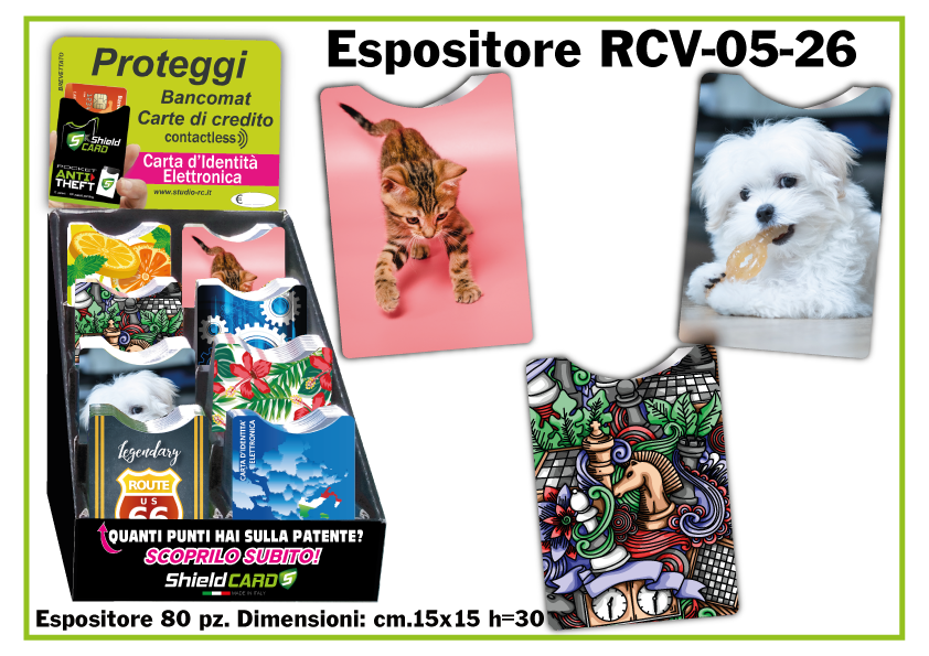 Oltre a produrre shieldcard personalizzati, abbiamo creato una linea nostra proposta all'interno di un espositore da banco, di dimensioni cm. 15x15 h=30 con capienza di 80 Shield card suddivisi in 8 figure per la vendita al pubblico in qualsiasi tipo di attività commerciale.